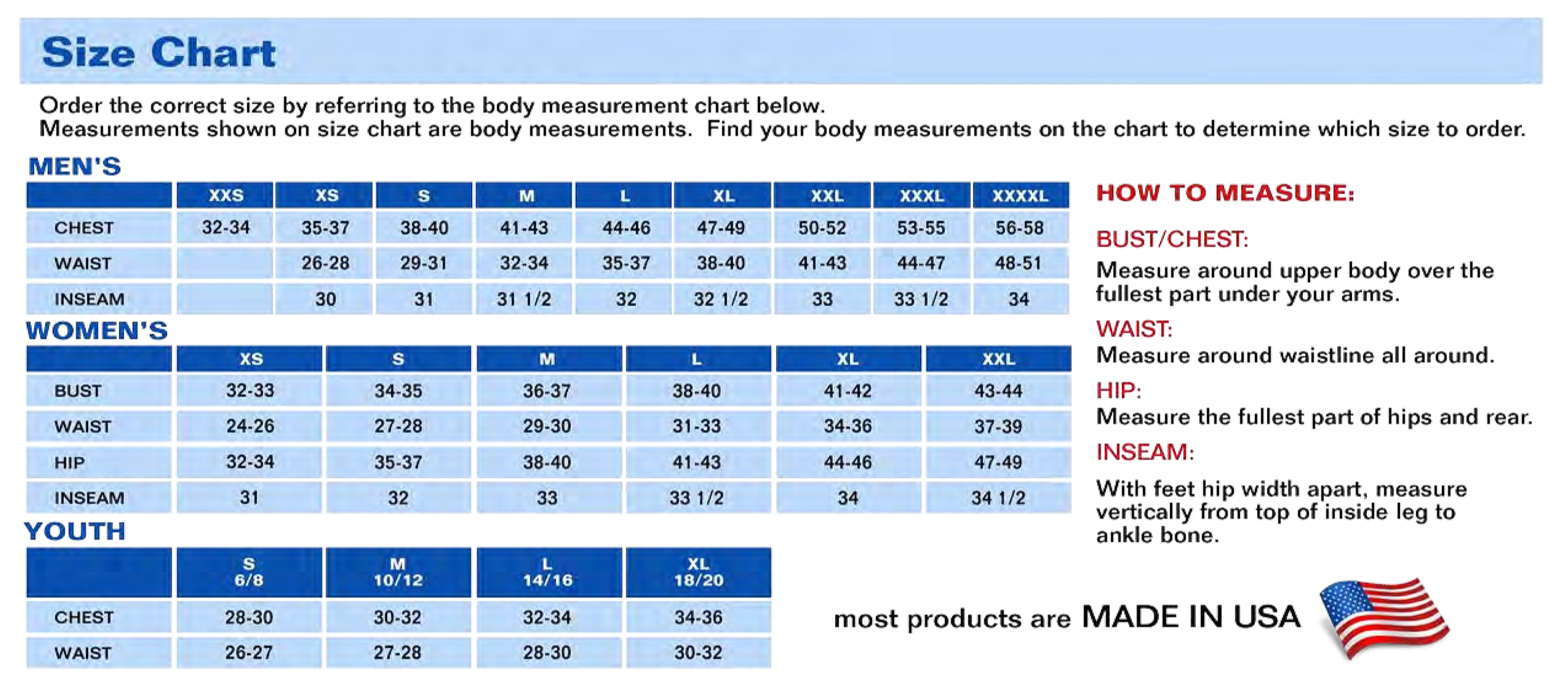 | Chest | 32-33 | 34-35 | 36-37 | 38-40 | 41-42 | 43-44 |